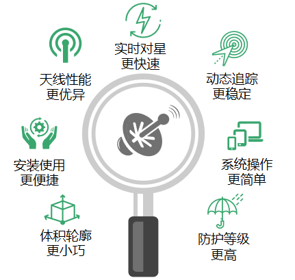 创新设计实现超低轮廓外形 安装时无需改造载具,适用范围更广 天线性能优异,频带宽、增益高,功耗低 对星速度快,电子扫描控制精准高效 动态追踪性能卓越,具备高动态工况下遮挡后快速捕获能力 操作简便,无需特殊测试校准设备 防护等级达到IP65,适应全天候工作